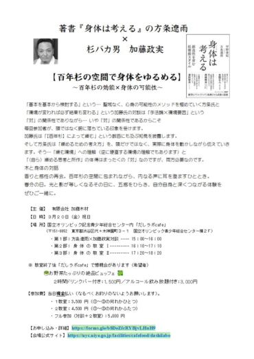 11月24日(火 祝日)方条遼雨×加藤政実対談!! 前回の9月も、とても好評だった 「両者の対談+方条先生の身体を動かすワークショップ」が再び実現します。 加藤は「杉でゆるむ」という数百にも及ぶ事例からの知見を述べます。…