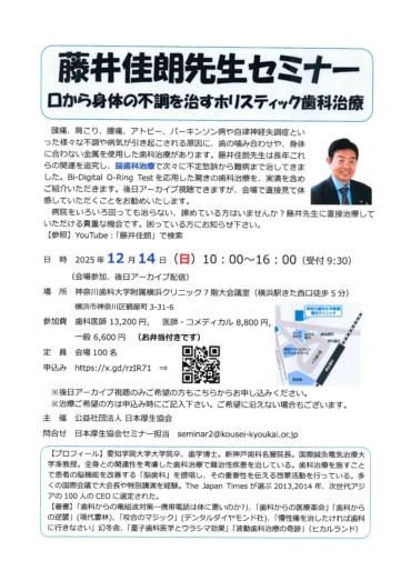 弊社代表の加藤政実が「身体のいとなみ」などについて ご教示いただいいてお世話になっている 脳歯科医の山本伊佐夫先生からの耳より講演会のご案内です!(①と②は一緒に申し込むと割引になります) ①帯津良一先生講演会 ホリステ…