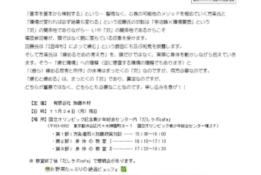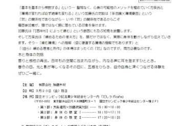 11月24日(火 祝日)方条遼雨×加藤政実対談!! 前回の9月も、とても好評だった 「両者の対談+方条先生の身体を動かすワークショップ」が再び実現します。 加藤は「杉でゆるむ」という数百にも及ぶ事例からの知見を述べます。…